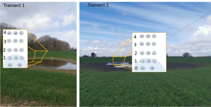 To address this gap, two transects were established in 2019, each extending along a slope from the center of a depression to the uphill area in Sorø, Denmark. The agricultural fields in this region are characterized by small undulating hills and depressions, typical of much of the Danish landscape. At each transect site, five positions were selected, spanning from the depression center to the uphill area (see Figure below). Biweekly in situ fluxes measurements of N2O and CH4 were conducted in triplicate at each position from November 2019 to July 2021. Soil moisture and temperature were recorded simultaneously during each flux measurement, followed by soil sample collections for laboratory analysis of physiochemical properties.